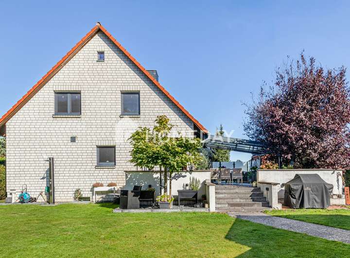 Der Außenbereich ist ein echtes Highlight: Der weitläufige Garten bietet viel Platz für Spiel- und Sportgeräte, individuelle Bepflanzung oder entspannte Freizeitgestaltung. Auch für Haustiere ist das Anwesen ein kleines Paradies – mit reichlich Platz zum Spielen und Entspannen. Ein charmantes Gartenhaus mit integrierter Theke lädt zudem zu geselligen Stunden ein und für Fahrzeuge stehen die Doppelgarage sowie drei bis vier Stellplätze im Freien zur Verfügung.