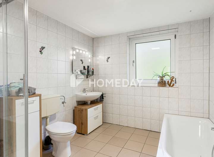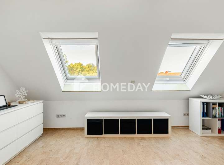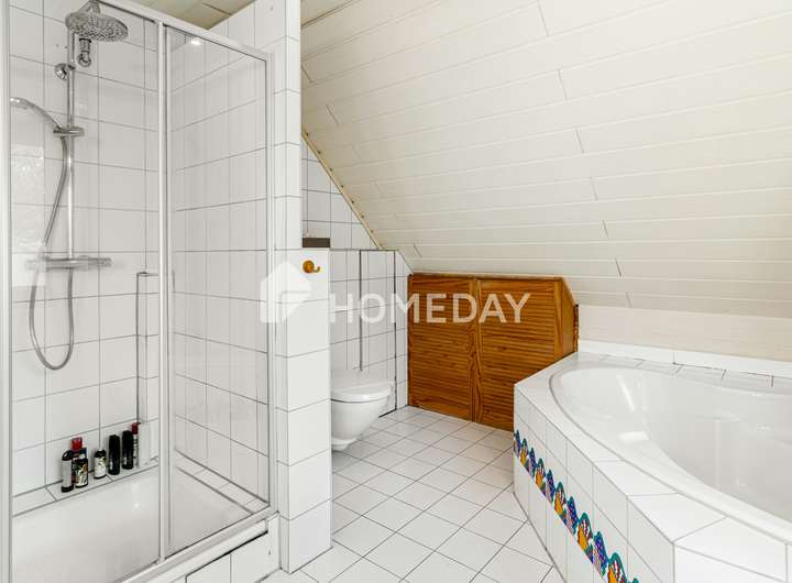 Das Dachgeschoss präsentiert sich hell und großzügig und bietet drei ansprechend geschnittene Schlafzimmer, die sich ideal als Elternschlafzimmer und Kinderzimmer eignen – eines davon wurde zuletzt als großzügiges Ankleidezimmer genutzt. Das geräumige Badezimmer lädt mit seiner gemütlichen Eckbadewanne, einer separaten Dusche und praktischen Einbauschränken zum Entspannen und Wohlfühlen ein. Die Immobilie ist voll unterkellert und bietet mit vier separaten Kellerräumen reichlich Platz für Hobbys, Lagerflächen oder Fitnessgeräte.