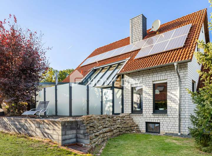 Die Ausstattung des Hauses umfasst Fliesen- und Laminatböden, wärmedämmende Kunststofffenster mit Dreifach-Verglasung und Rollläden sowie eine effiziente Gaszentralheizung mit Warmwasserspeicher, die auch über Solar betrieben werden kann. Zudem sorgt eine Photovoltaikanlage mit einer Leistung von 8 kWp für eine nachhaltige Energiegewinnung, wobei die Solarenergie derzeit zu 100 % eingespeist wird.