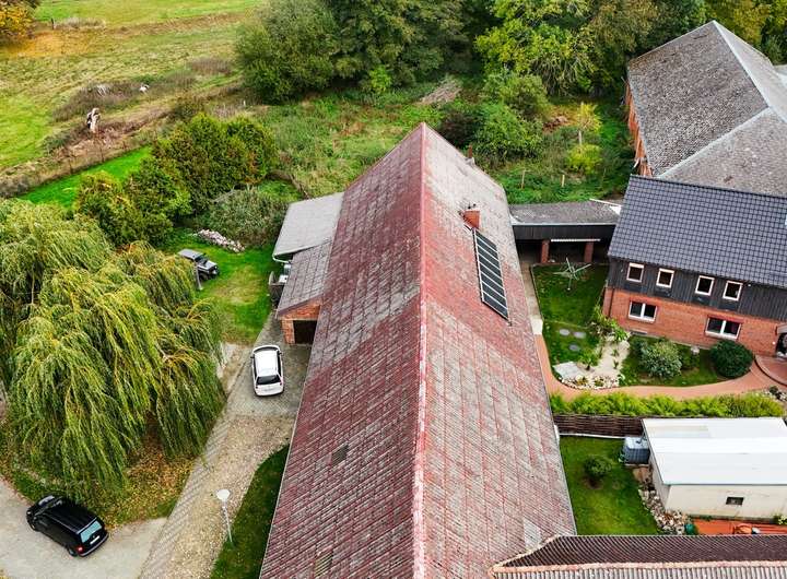 Ein besonderes Highlight ist die große Scheune mit zahlreichen Nutzungsmöglichkeiten – etwa als Werkstatt, Lager oder Eventraum. Ein Teil wurde 2021 als Partyraum modernisiert und lädt zu gemütlichen Feiern ein. Das weitläufige Grundstück mit altem Baumbestand und gepflegten Gartenbereichen sorgt für absolute Privatsphäre.