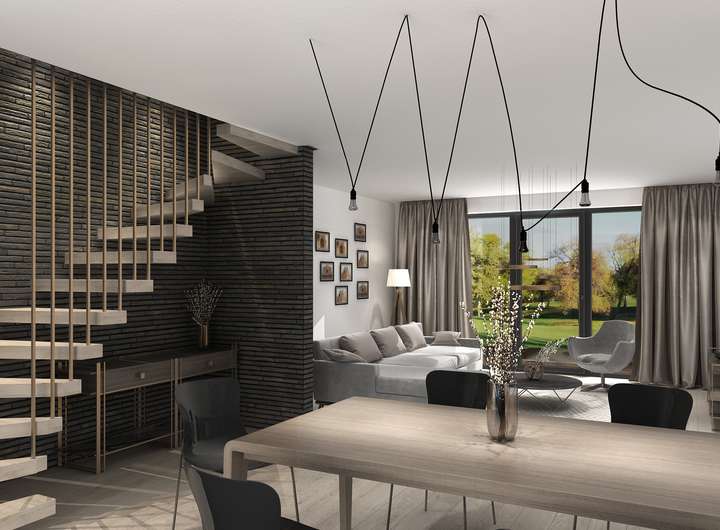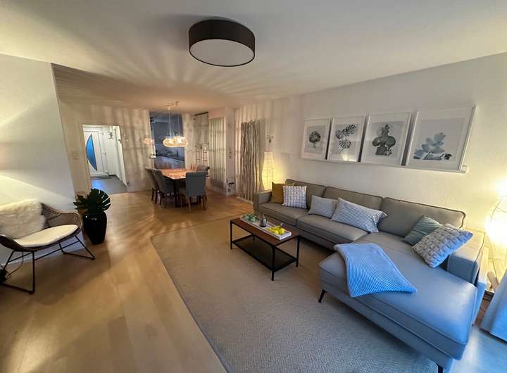 Der großzügige Wohn- und Essbereich mit direktem Zugang zur Terrasse bildet das Herzstück des Erdgeschosses – perfekt für gemeinsame Familienmomente und entspannte Abende. Große Fensterflächen sorgen für viel Licht und schaffen ein modernes, freundliches Wohnambiente.