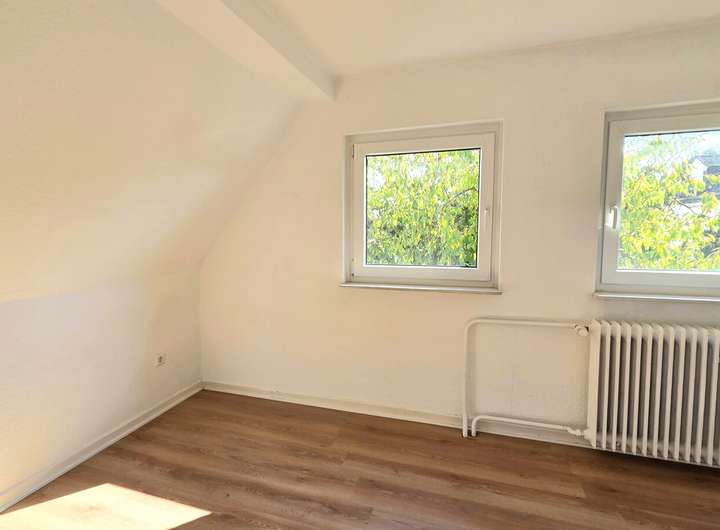 Über eine Holztreppe gelangt man in die obere Wohneinheit. Diese überzeugt durch ihren praktischen Grundriss und die, in den letzten Jahren, teilweise erneuerten Fenster. Sie verfügt über ein Schlafzimmer mit angrenzendem kleinen Raum sowie ein weiteres Zimmer mit begehbarem Ankleidebereich. Das große Wohnzimmer mit Zugang zum Balkon bietet darüber hinaus viel Platz und einen herrlichen Blick in den Garten. Auf dieser Etage befindet sich auch ein Badezimmer mit Wanne.