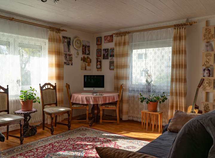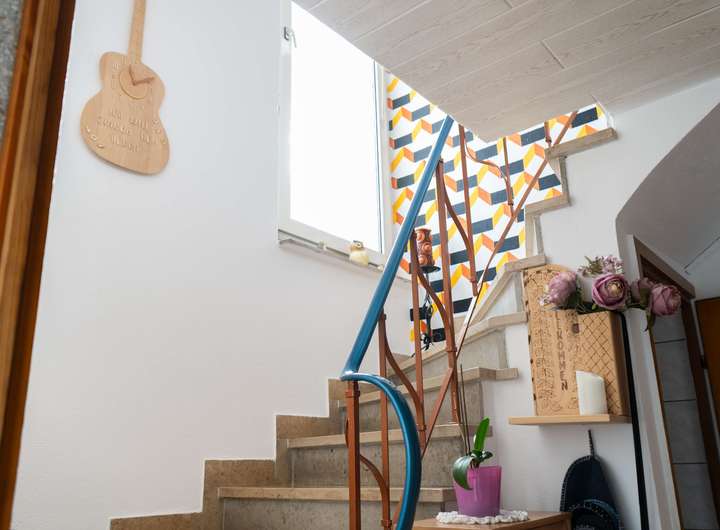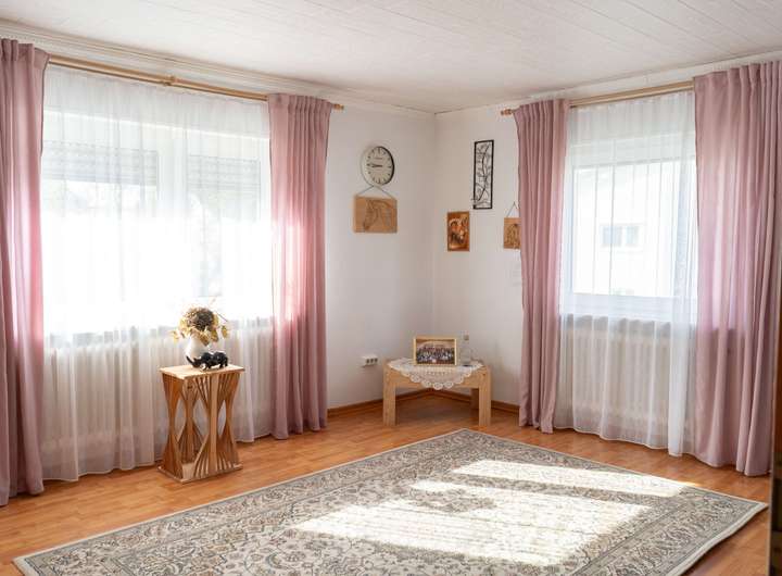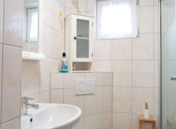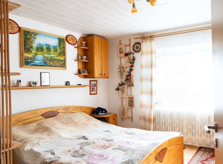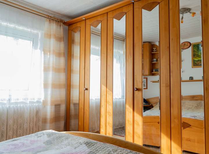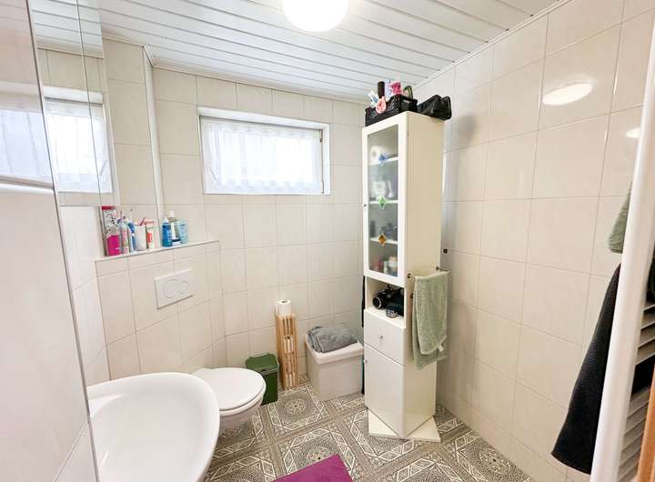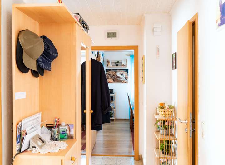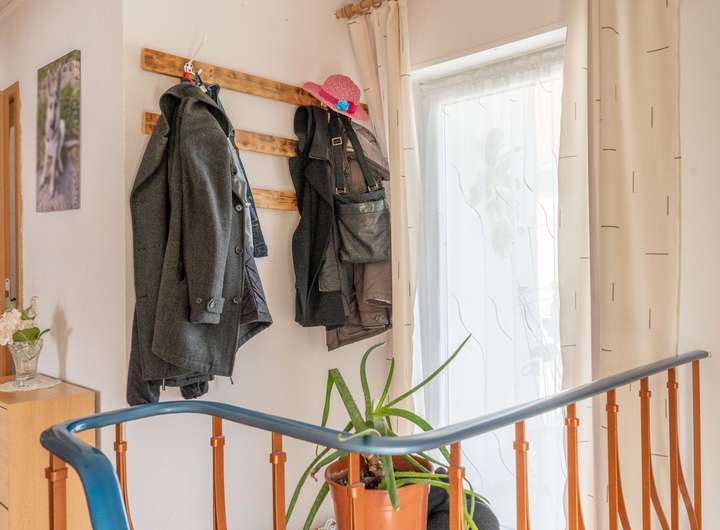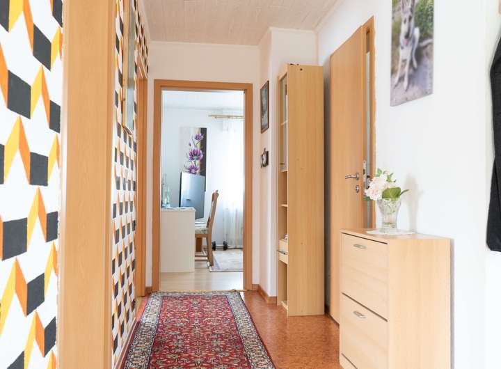 Auf zwei Vollgeschossen und 124 Quadratmetern verteilt befinden sich vier Schlafzimmer und zwei Bäder. Das Haus ist wirklich gut geschnitten, weshalb wir im Erdgeschoss eine Art Vorraum vor der eigentlichen Wohnung haben. Dieser kann als großzügige Garderobe dienen.