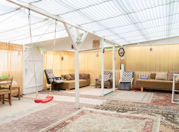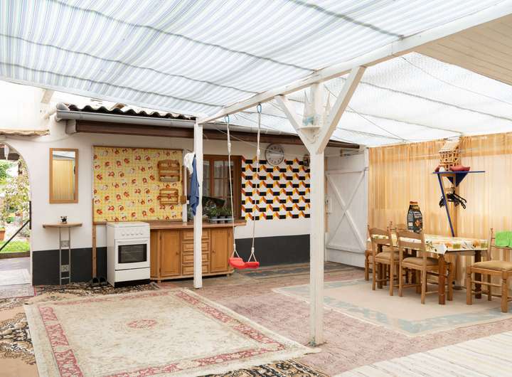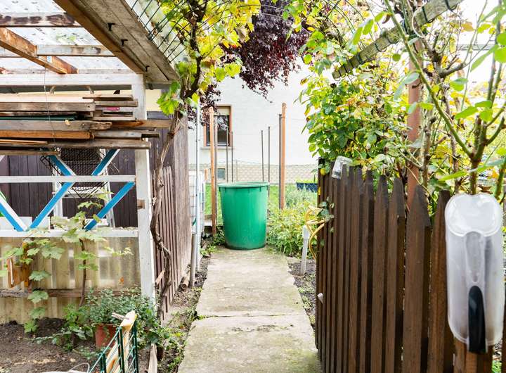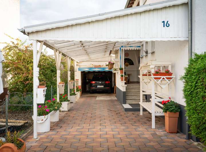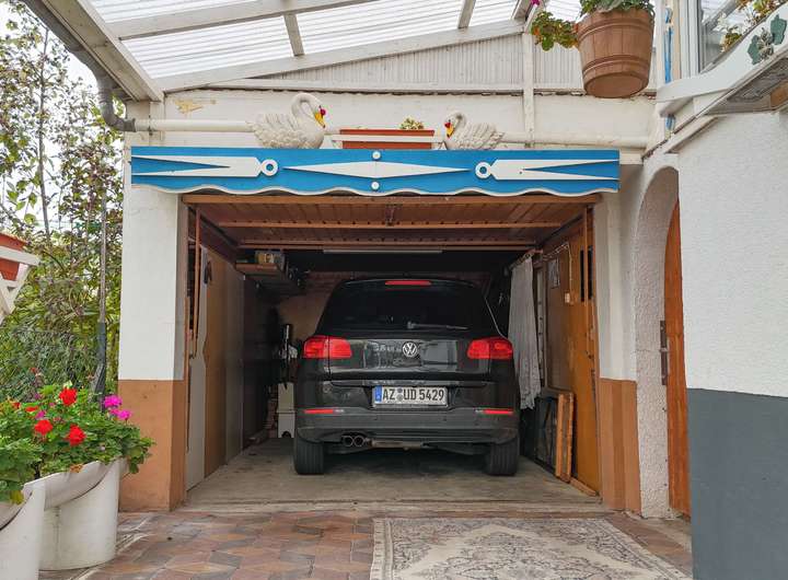 Das Haus steht auf einem 550 Quadratmeter großen Grundstück, weshalb wir hinter dem Haus eine wirklich große überdachte Terrasse haben. Diese grenzt an die Garage mit kleiner Werkstatt an.