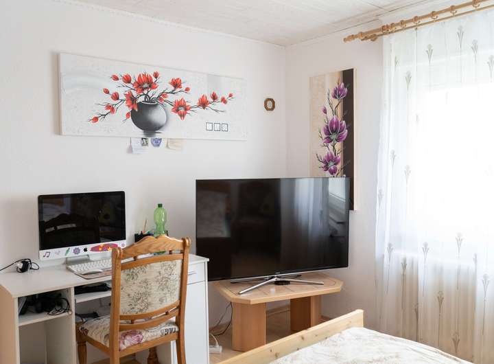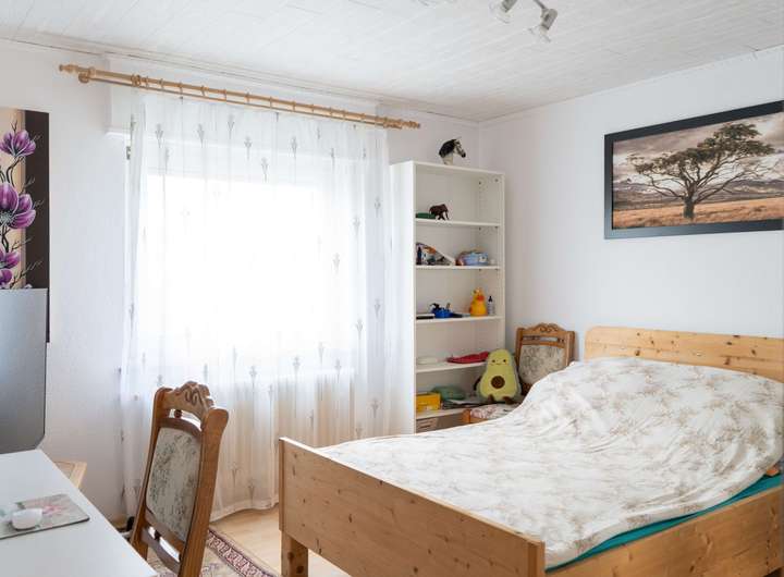 Durch die Garderobe kommen wir auch direkt zum eigentlichen Wohnraum. Mit einem Schlafzimmer, dem Wohnzimmer, der Küche und einem Duschbad ist das Erdgeschoss vollständig. Über die Treppe im Flur gelangen wir in das Obergeschoss, welches mit drei großen Schlafzimmern genug Platz für die ganze Familie bietet. Abgerundet wird dieses durch ein weiteres Duschbad und einen Balkon mit Blick in den eigenen Garten.