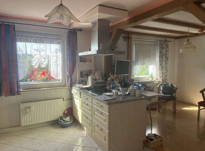 Im Erdgeschoss angekommen, gibt es einen großen Anbau mit Glasfront, eine Küche mit Einbauküche, ein kleines Wohnzimmer mit Kaminofen und ein Bad mit Dusche.