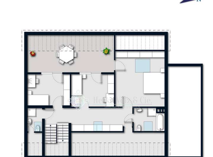 Die Immobilie verfügt über zwei Terrassen: Eine große Terrasse im Erdgeschoss mit direktem Zugang über eine Treppe in den Garten, sowie eine sonnige Loggia im Dachgeschoss, die zum Entspannen und Verweilen einlädt.