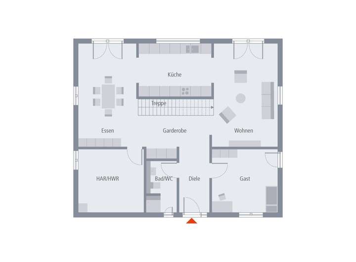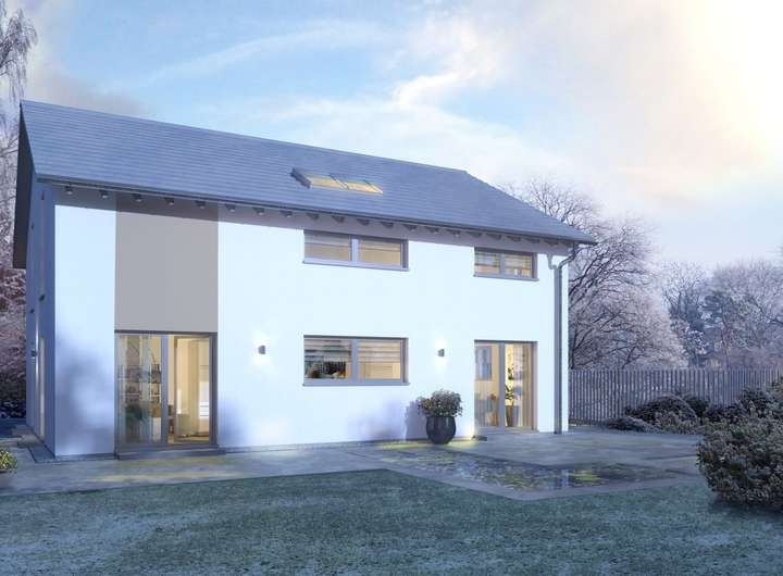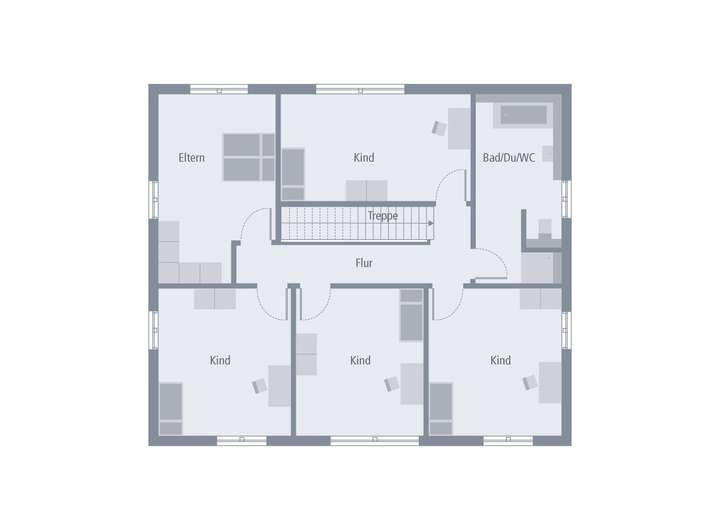 Das Design 19.1 ist der Traum jeder Großfamilie. Vier Kinderzimmer stehen im Obergeschoss zur Verfügung und bieten viele Möglichkeiten der Gestaltung. So können hier beispielsweise vier Schlafzimmer, aber auch eine Variante aus Schlaf- und Spielzimmer entstehen. Das Elternschlafzimmer sowie ein geräumiges Bad mit Badewanne und Dusche runden das Raumangebot in dieser Etage ab. Viele Räume, aber keine beengten Verhältnisse, denn alle Familienmitglieder haben dank der cleveren Raumaufteilung rund 16 m² Platz zum Leben, Schlafen und Entspannen. Komfortabel gestaltet sich auch das Erdgeschoss, das durch seine besondere Aufteilung besticht. In den Wohn-Ess-Bereich integriert und doch räumlich abgetrennt liegt die Küche als Mittelpunkt dieser Ebene. Das verleiht den Räumen ein ganz besonderes Flair - offen und doch gemütlich. Ein weiteres großes Zimmer, das beispielsweise für Gäste oder als Büro genutzt werden kann, ein Hauswirtschaftsraum sowie ein Gäste-WC befinden sich ebenfalls im Erdgeschoss.