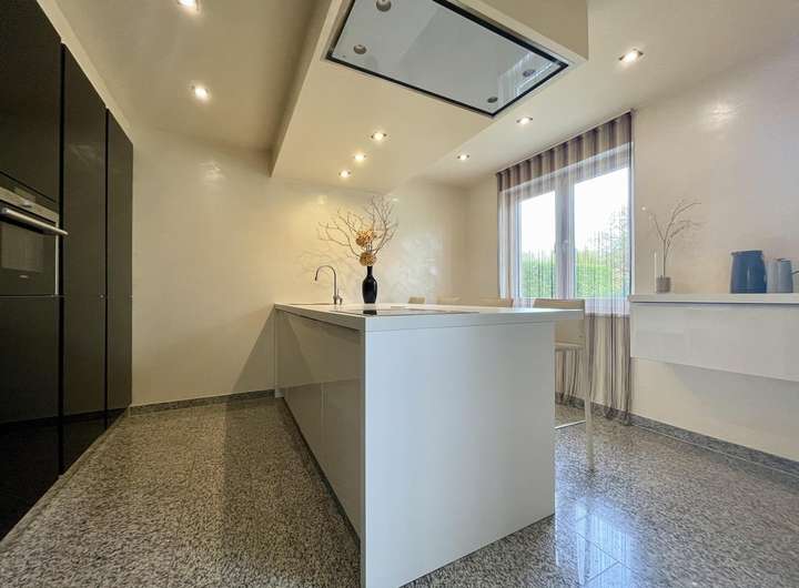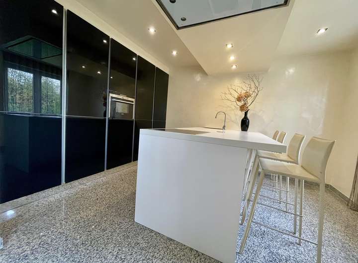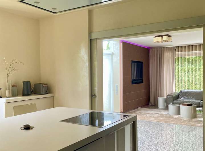 Die moderne Küche ist offen integriert, kann aber bei Bedarf durch eine elegante Glastür abgetrennt werden - perfekt für Familien, die gerne kochen, aber auch Wert auf klare Raumstrukturen legen.