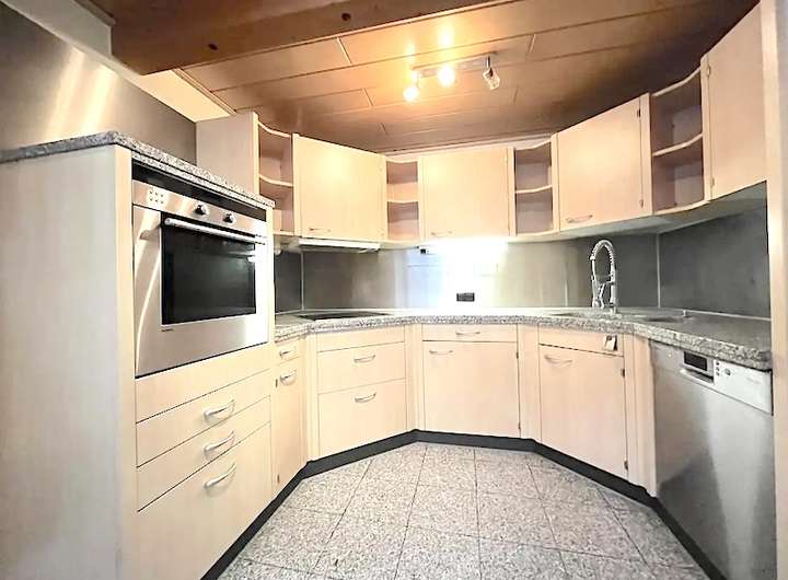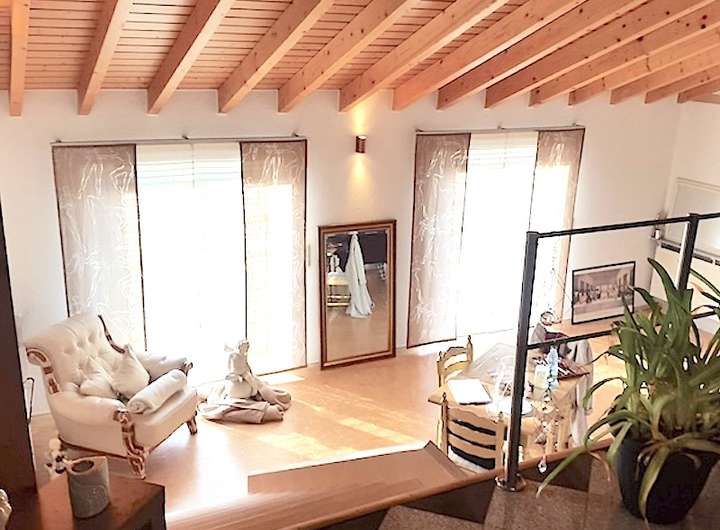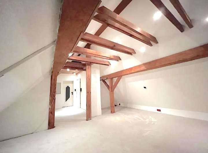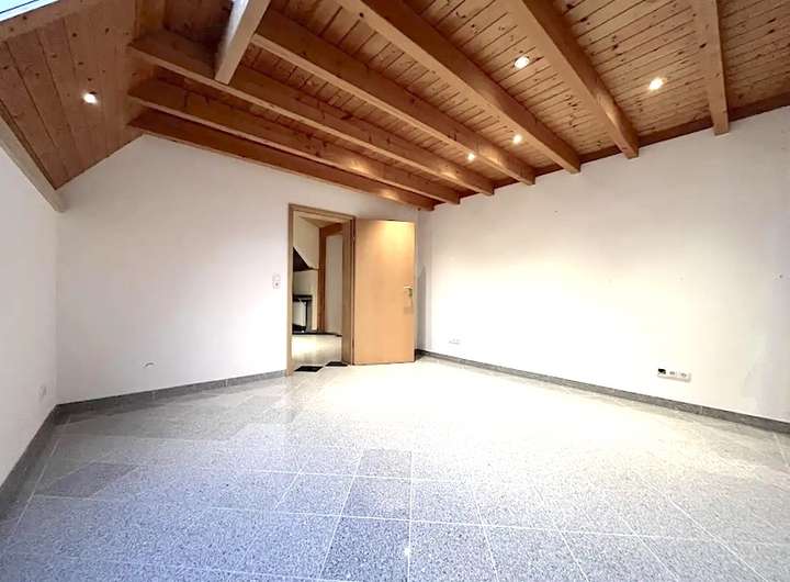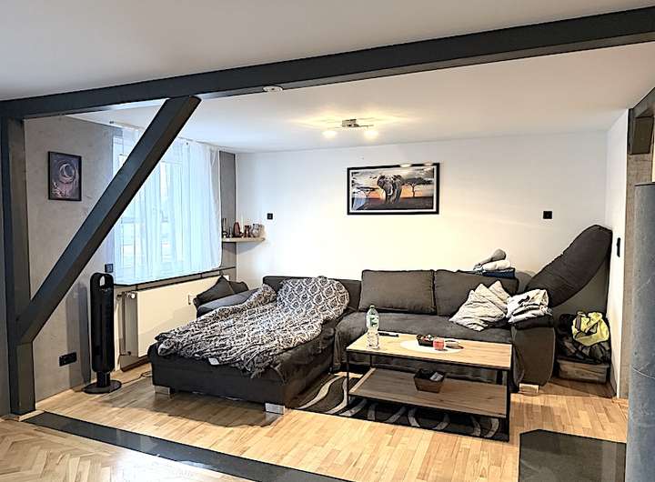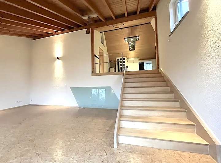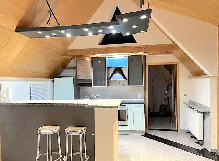 Die schicke Split-Level-Wohnung im Obergeschoss besticht durch ihr einzigartiges Loft-Design und eine durchdachte Raumaufteilung, die modernes Wohnen mit angesagter Funktionalität stimmig vereint. Der Eingang im American-Style öffnet sich direkt zur kompakten, gut ausgestatteten Küche. Auf dieser Ebene befinden sich ergänzend das helle Tageslichtbad und das behagliche Schlafzimmer. Vom Entrée führen einige Treppenstufen hinab in den imposanten Wohnbereich. Hohe, zum Dach hin offene Decken und die in den Wohnraum integrierten Holzbalken schaffen in Kombination mit der fließenden Raumkonzeption eine markante und zugleich behagliche Wohnatmosphäre.