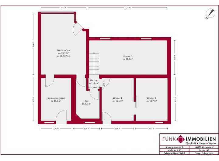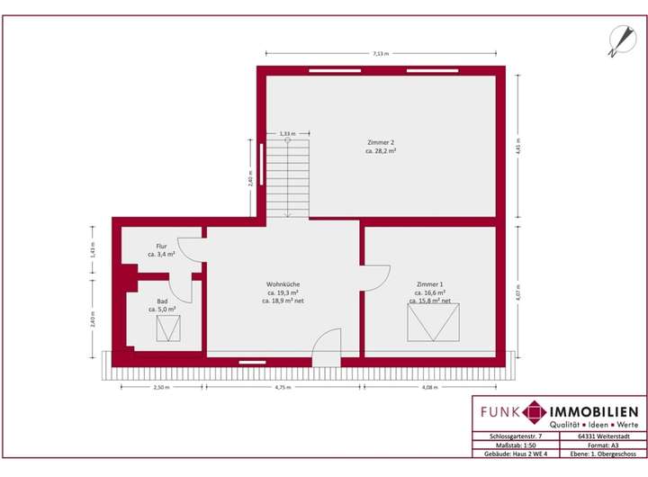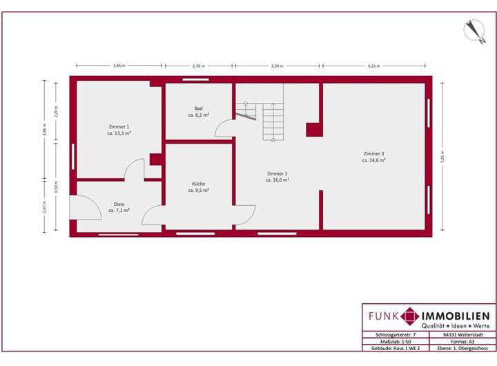 Bei den hier veröffentlichten Grundrisszeichnungen handelt es sich um Exposégrundrisse, die ausschließlich zur Orientierung dienen, wie die Flächen aktuell genutzt werden bzw. bisher genutzt wurden. Eine Ableitung bezüglich genehmigter Wohnflächen bzw. Nutzflächen, wie auch die Richtigkeit der angegebenen Quadratmeterzahlen, ergibt sich hieraus nicht.