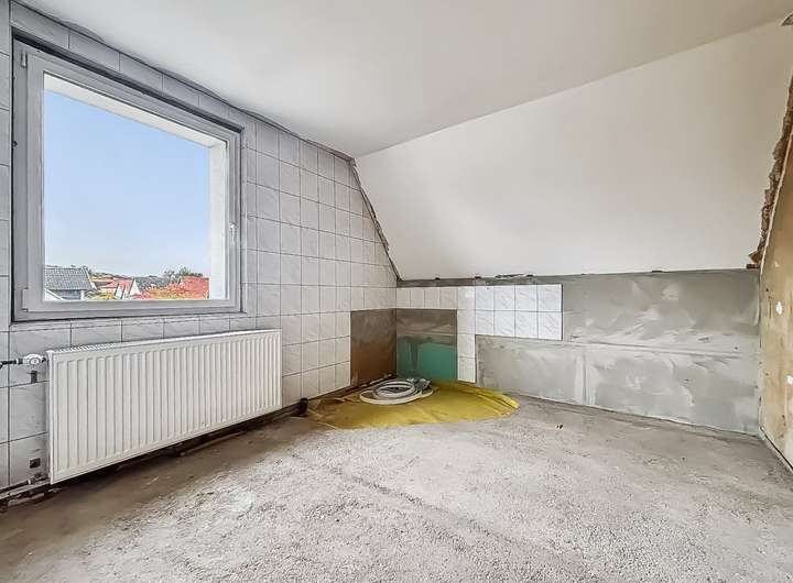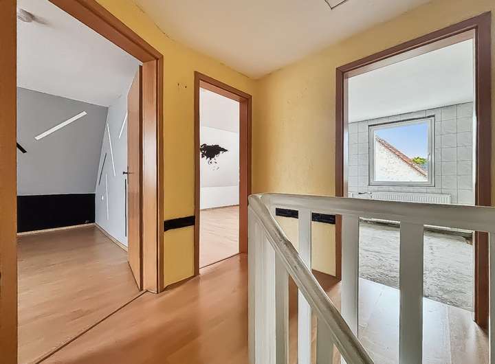 Das vollunterkellerte Einfamilienhaus bietet Ihnen insgesamt ca. 116 m² Wohnfläche, welche sich auf ein Erdgeschoss und ein Dachgeschoss aufteilt. So finden Sie im Erdgeschoss drei Zimmer, ein Duschbad sowie eine Küche und eine Terrasse. Das Dachgeschoss bietet Ihnen hingegen drei Zimmer und ein Badezimmer, welches noch ausgebaut werden muss. Die genaue Raumaufteilung entnehmen Sie bitte den beigefügten Grundrissen.