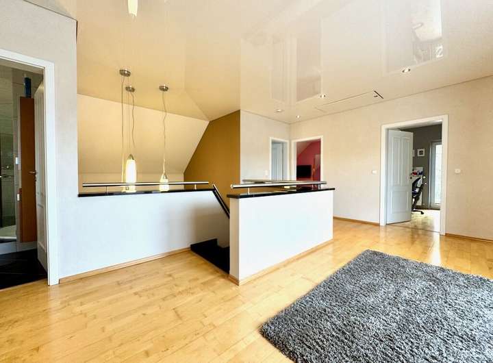 Über die Diele führt ein massiver Treppenaufgang mit Edelstahlgeländer in das Obergeschoss mit Galerieebene - die exklusiven Ausstattungsmerkmale wie Parkettboden und Lackdecken setzen sich auch hier fort.