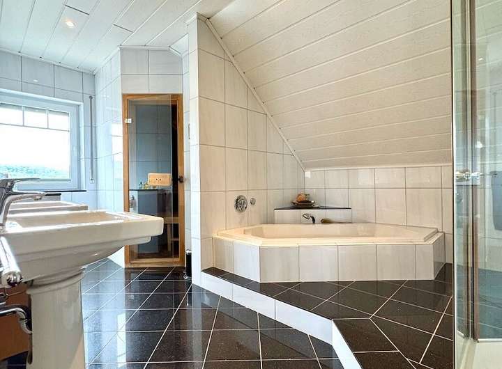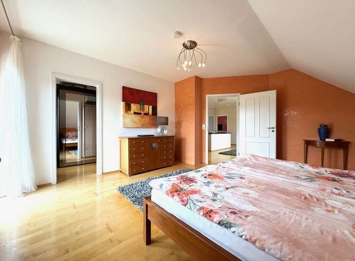 Das geräumige Schlafzimmer mit Ankleidezimmer hat einen tollen Balkon mit herrlichem Fernblick in die Felder und Wiesen - das Badezimmer hat eine Eckbadewanne und eigenständige Dusche sowie die entspannende Infrarotkabine.