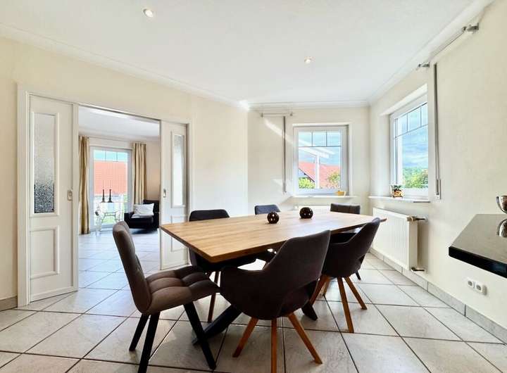 Ein wertvoller Erker ist auch hier vorhanden und spendet Raumgefühl im Wohn-/Essbereich - ein neuwertige Einbauküche ist verbaut.