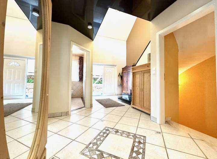 Die Haupteinheit mit Zugang von der Westseite - Stellplätze mit Carport vor der Tür - umfasst ca 171 qm an lichtdurchfluteten Wohnraum. Der geräumige Eingangsbereich mit abgehängter Lackdecke bietet Platz für eine große Garderobe und Schuhe, eine Abstellkammer ist hier ebenso vorhanden wie das Gäste-WC mit Tageslicht.
