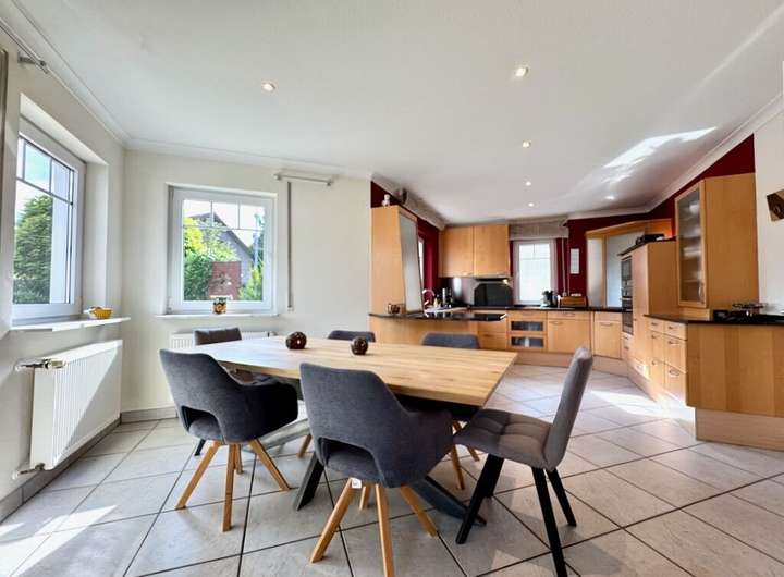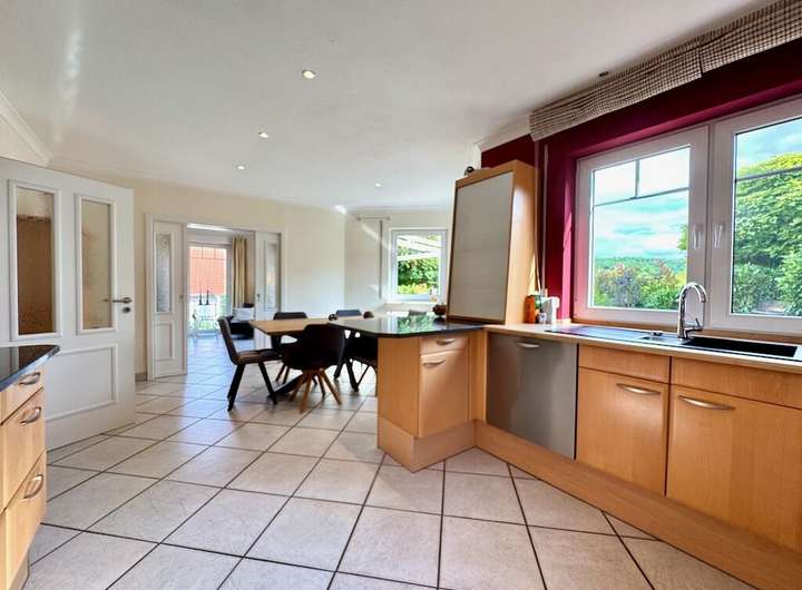 In einer sehr geräumigen Küche (Geräte auf Komforthöhe) schafft der wertvolle Erker Platz für den Essbereich und man genießt direkt den Ausblick in den schönen Garten und erfreuet sich am Tageslichteinfall.