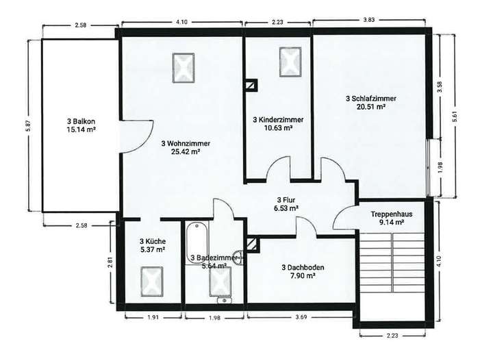 D A C H G E S C H O S S : - 3 Zimmerwohnung mit ca. 69 m² mit Balkon, sowie Nutzfläche von ca. 9 m²