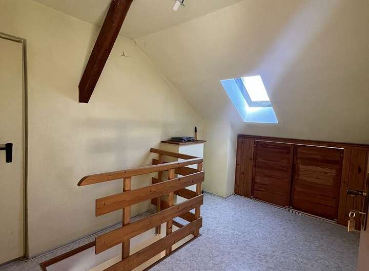 Das Obergeschoss beinhaltet: 1 Zimmer, 1 Wohnzimmer mit einem offenen Kamin, 1 Bad mit Dusche und Doppelwaschbecken, sowie ein weiteres Zimmer. Vom Flur aus führt eine Treppe ins ausgebaute Dachgeschoss.
