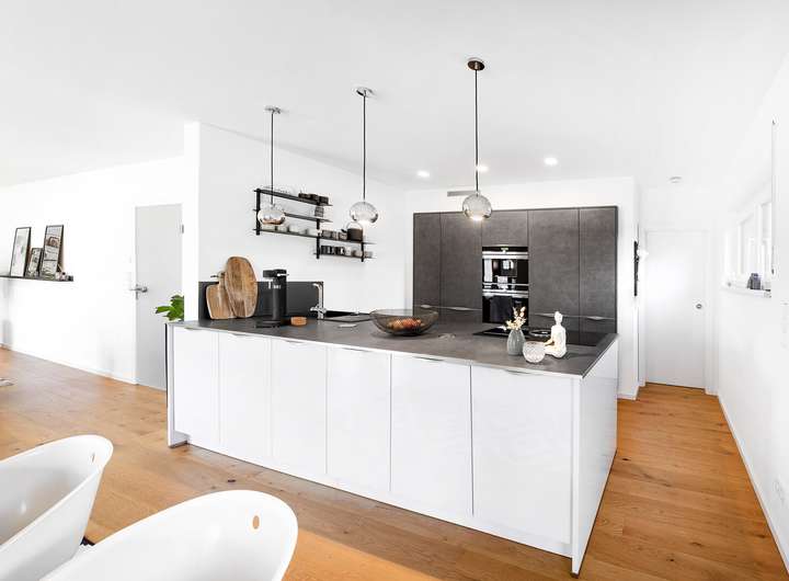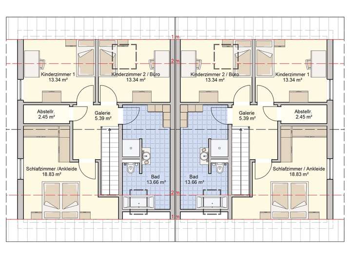 Hier treffen Luxus und Praktikablität aufeinander: im Duett 141. Durch die geradlinige Treppe ensteht eine optimale Wohnflächenaufteilung auf zwei Ebenen. Im Erdgeschoss kann der lichtdurchflutete Wohn-/Essbereich den zentralen Treffpunkt der Familie bilden. Ruheinseln finden sich im Dachgeschoss. Zwei nahezu gleichgroße mögliche Kinderzimmer geben hier ausreichend Spielraum für die jüngsten Bewohner des Hauses. Alternativ kann ein Büro anstelle eines Kinderzimmers integriert werden. Das Elternschlafzimmer besticht mit zeitgemäßer Ankleide. Zusätzlich lädt das exklusive Luxusbadezimmer zum Relaxen ein. Angrenzend an die großzügige Galerie bedindet sich ein praktischer Abstellraum. Kurzum: Eine intelligente Gebäudekonstruktion punktet durch optimale Raumausnutzung und gehobenem Komfort.