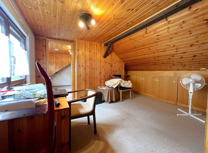 Im 1. Obergeschoss befinden sich zwei weitere Zimmer, eine Küche und ein Bad. Von hier führt eine Treppe ins ausgebaute Dachgeschoss, wo sich zwei weitere Zimmer und ein Vorraum befinden – perfekt als zusätzlicher Wohnraum, Kinderzimmer oder Homeoffice. Ein besonderes Highlight: die kleine Dachterrasse mit Blick ins Grüne – ein echter Rückzugsort.