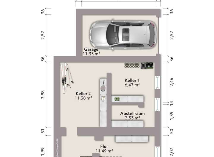 Das Haupthaus ist vollständig unterkellert. Die Kellerräume bieten viel Stauraum, Platz für Hobbys oder z.B. zur Nutzung als Weinkeller.