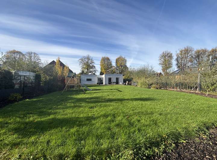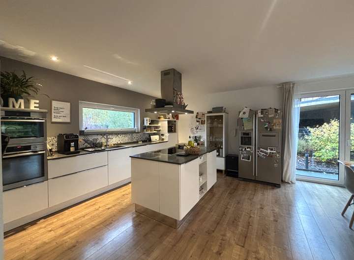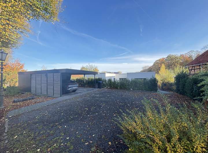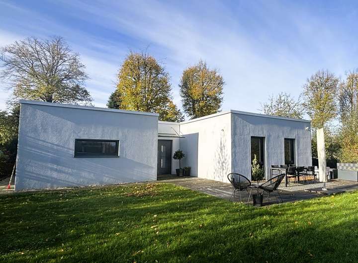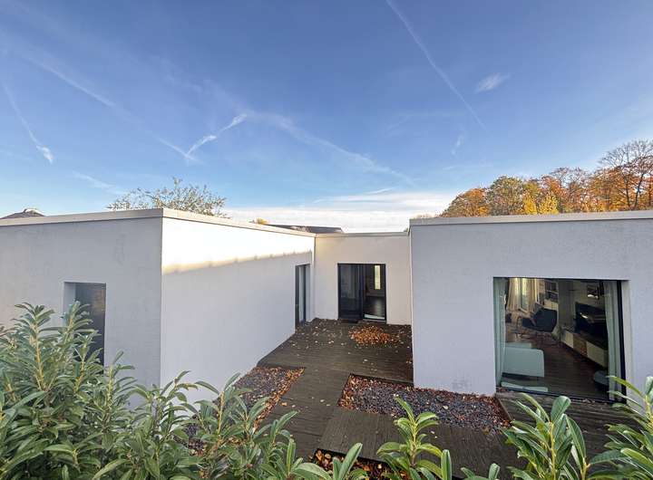 Zum Verkauf steht ein großzügiges und ansprechendes Grundstück in begehrter Waldrandlage – mit direkter Zuwegung zum Wald durch den eigenen Garten steht hier in harmonischer Ausrichtung ein schicker, energieeffizienter Bungalow.