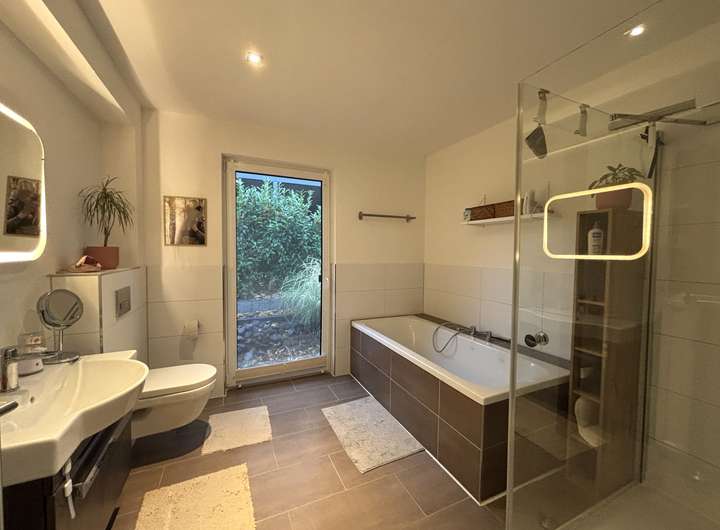 Das Haus wurde stets gepflegt und überzeugt durch seine durchdachte Raumaufteilung. Neben fünf attraktiven Zimmern verfügt das Objekt über ein separates Gäste-WC mit Dusche sowie ein weiteres Bad en Suite mit begehbarem Kleiderschrank im Elternschlafzimmer.