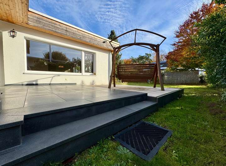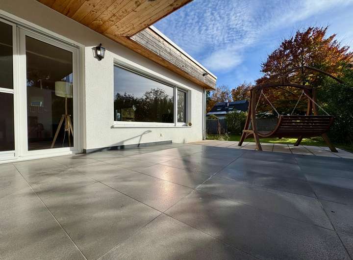 Der offen gestaltete Wohn- und Essbereich mit seinen großen Panoramafenstern sorgt für eine lichtdurchflutete Atmosphäre und bietet direkten Zugang zur traumhaften, nach Südwesten ausgerichteten und teilweise überdachten Terrasse. Von hier aus öffnet sich der weitläufige Garten – ein echtes Kinderparadies mit viel Platz zum Spielen und Entspannen.