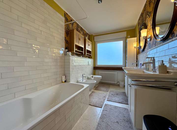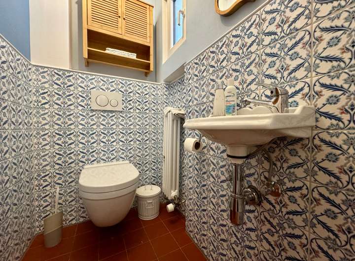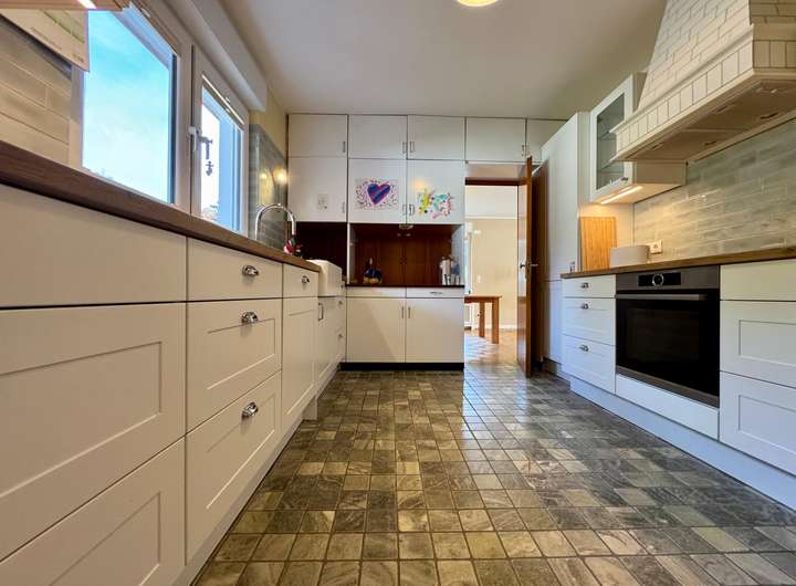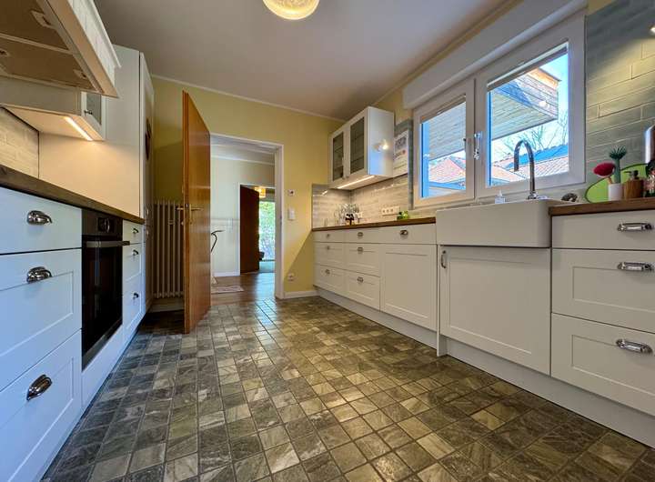 Die Küche ist sowohl vom Flur als auch direkt vom Wohnbereich aus erreichbar, was kurze Wege und ein durchdachtes Raumkonzept ermöglicht. Das 2018 vollständig sanierte Tageslichtbad überzeugt mit modernen Fliesen, Doppelwaschbecken und hochwertiger Ausstattung. Auch das Gäste-WC wurde im Zuge der Sanierung erneuert.