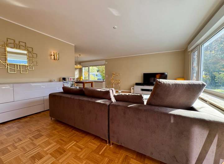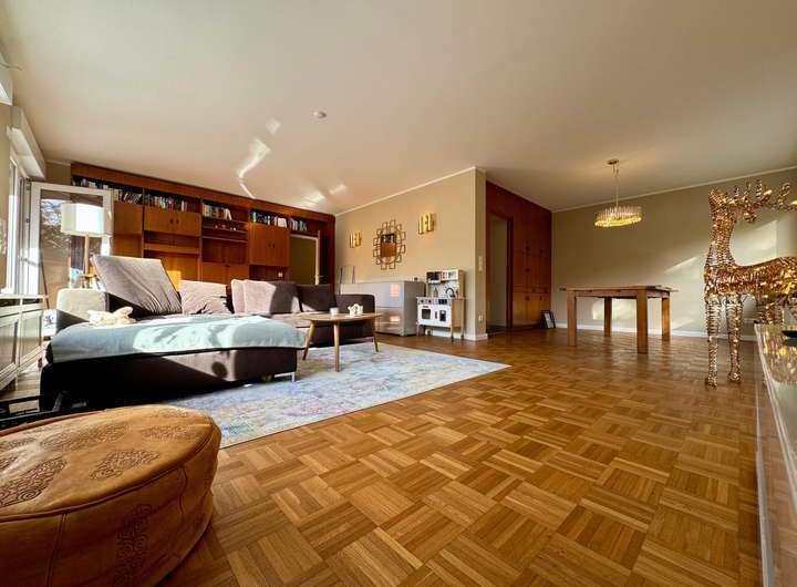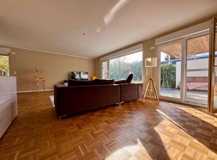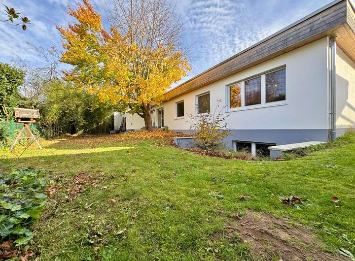 Der im Jahr 1965 erbaute Bungalow zählt zu den wenigen Häusern dieser Bauart, die über eine rund fünfzigprozentige Unterkellerung mit zusätzlicher Ausbaureserve verfügen. Der familienfreundliche Grundriss umfasst im Erdgeschoss vier helle Zimmer sowie zwei weitere, wohnlich ausgebaute Räume im Untergeschoss, die sich flexibel als Gästezimmer, Büro oder Hobbyräume nutzen lassen.