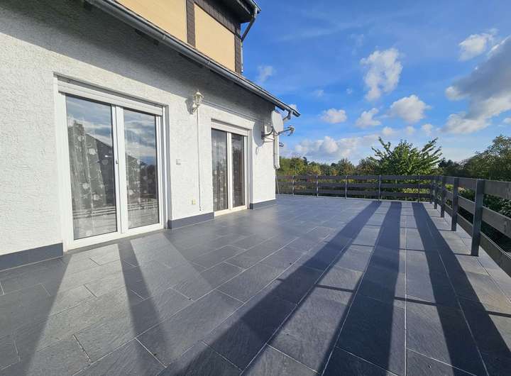 Im 1. Obergeschoss lädt eine zweite, großzügige Terrasse mit Zugang zu einem separaten Hobbyraum und Blick ins Grüne zum Entspannen ein.