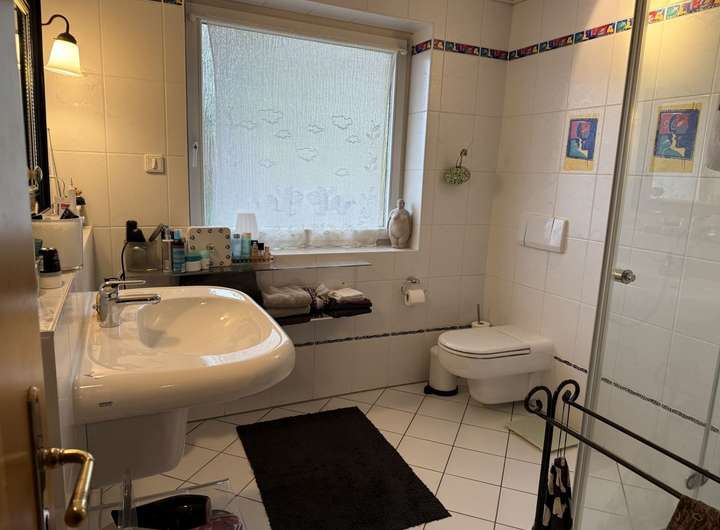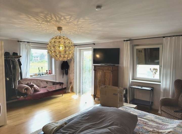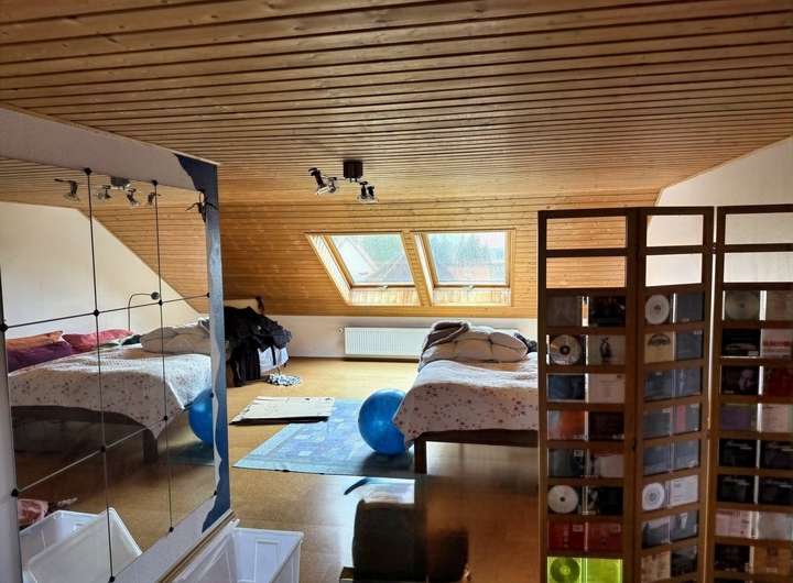 Im Obergeschoss stehen Ihnen ein großes Schlafzimmer mit Balkon, ein Kinderzimmer und ein Bad mit bodentiefer Dusche zur Verfügung. Bei Bedarf lässt sich das Schlafzimmer, wie ursprünglich vorgesehen, wieder in zwei Zimmer aufteilen. Der großzügige Raum im Dachgeschoss bietet z.B. für Ihren Teenager ein tolles Platzangebot.