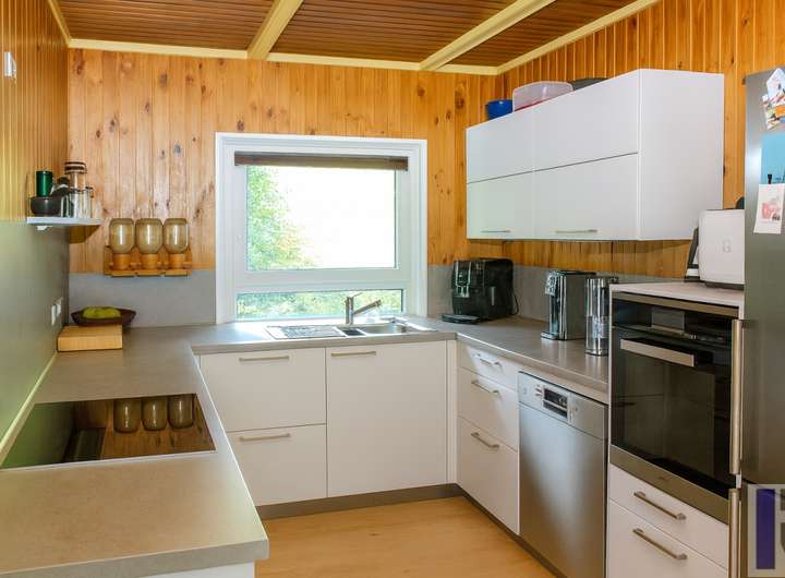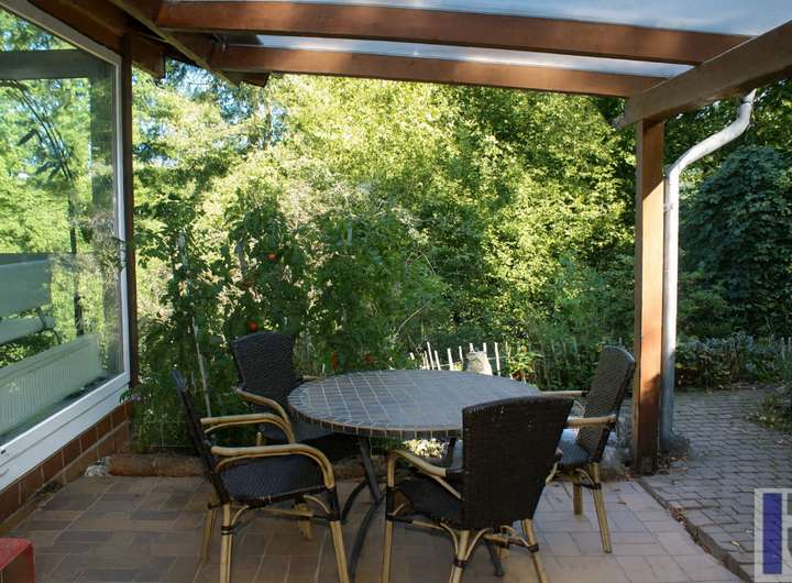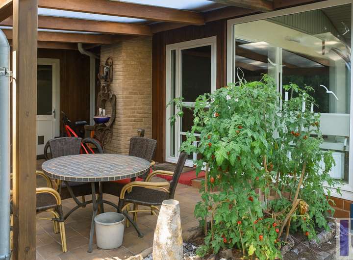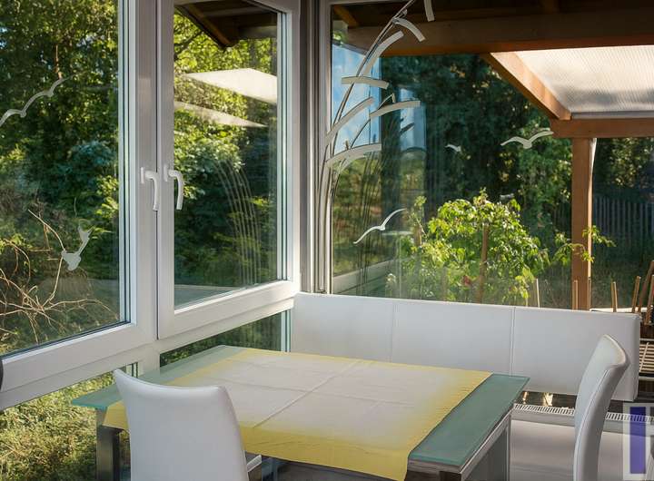 Ein offener und geräumiger Wohn- und Essbereich mit angrenzendem Wintergarten mit offener Küche bilden das Herzstück des Hauses. Vom Wohnbereich besteht ein direkter Zugang zur überdachten Terrasse und in den individuell angelegten Garten mit befestigten Wegeflächen.
