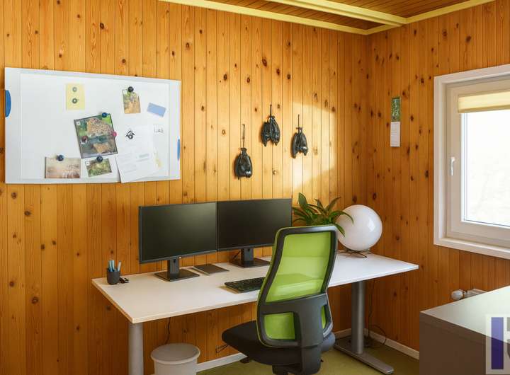 Das Raumangebot wird ergänzt durch ein Schlafzimmer, ein Kinderzimmer, das auch ideal als Büro genutzt werden kann, ein modernes Badezimmer sowie einen praktischen Abstellraum.