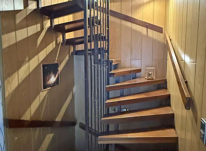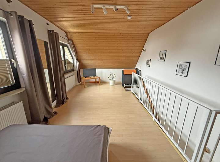Die Einliegerwohnung ist über beide Ebenen offen gestaltet, verbunden mit einer Holztreppe.