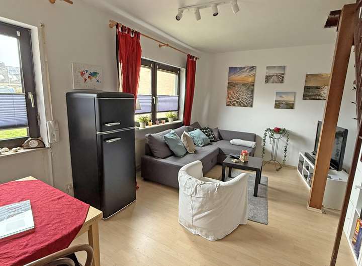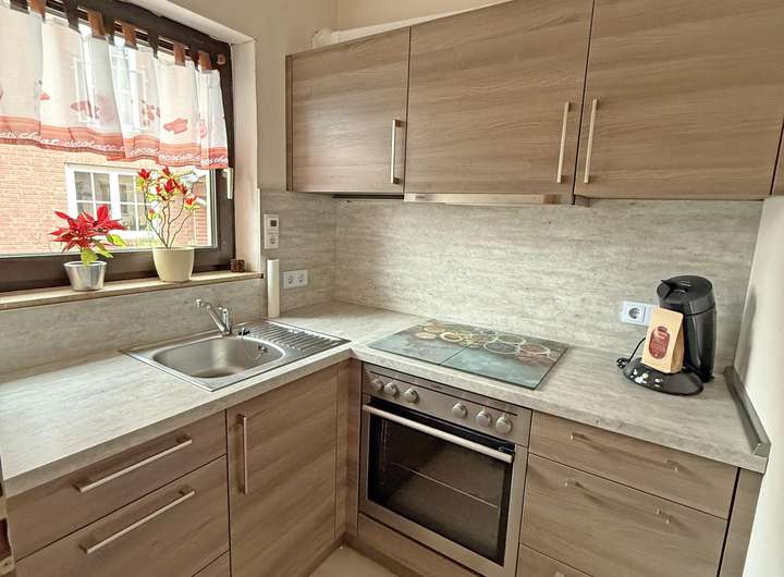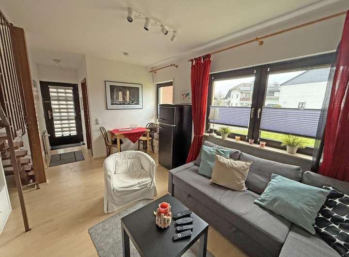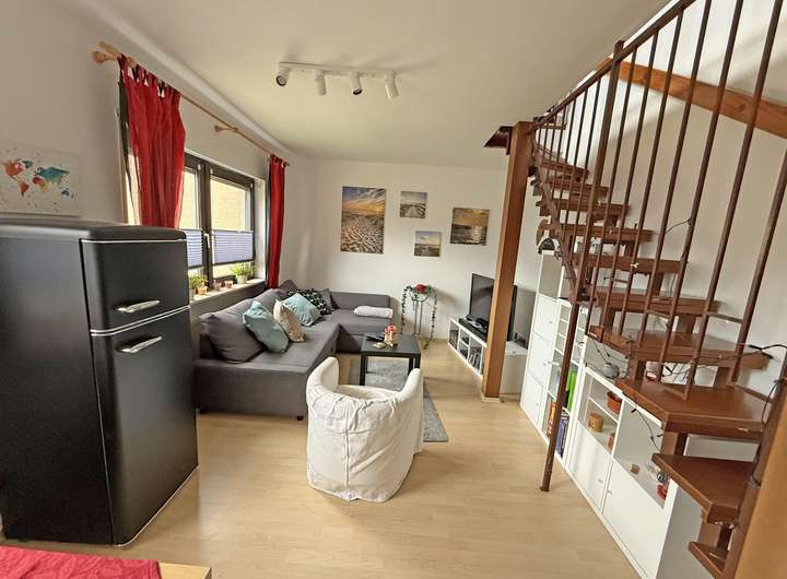 In der unteren Ebene sind eine kleine Küche mit EBK und der Wohnbereich,