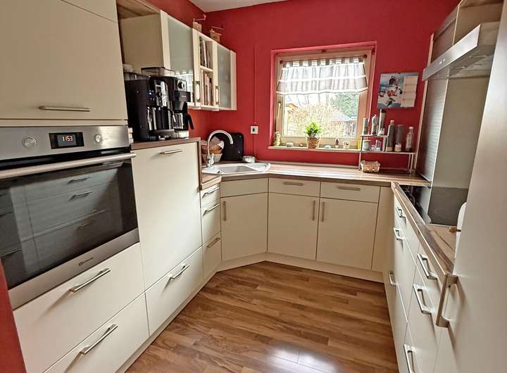 Praktisch ist auch der direkte Zugang vom Essbereich in die Küche, die mit einer hellen, sehr gepflegten EBK ausgestattet ist. Im EG befindet sich weiterhin das Gäste- WC.