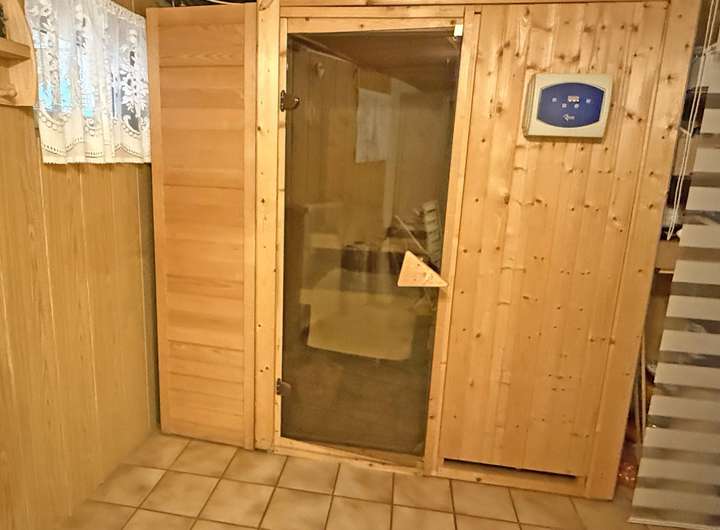 In einem weiteren, abgeschlossenen Bereich befinden sich eine Sauna mit einer Dusche sowie die Anschlüsse für Waschmaschine und Trockner.
