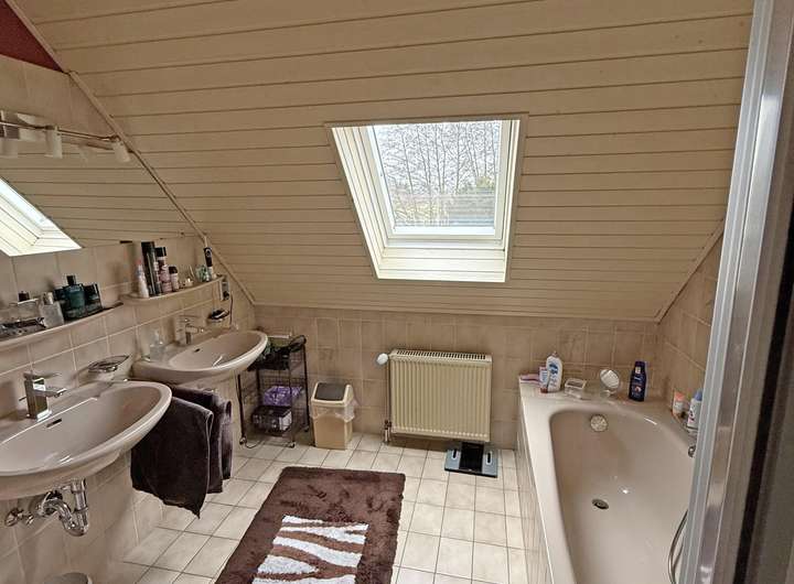 Im Dachgeschoss sind zwei Schlafzimmer und das Tageslicht-Badezimmer mit zwei Waschbecken,