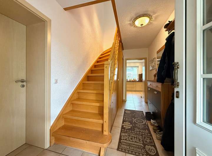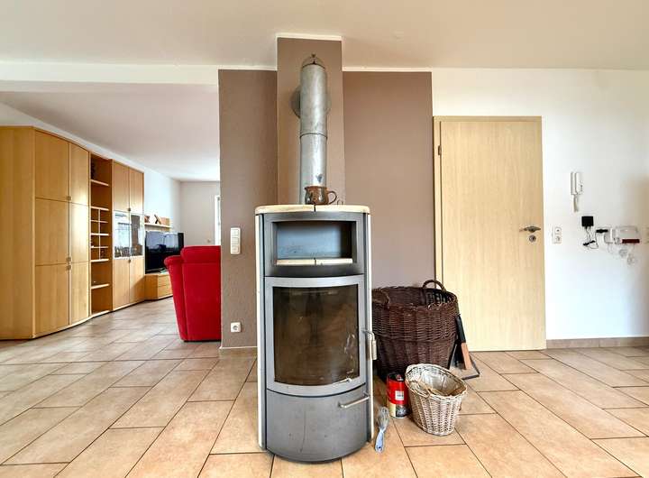 Im Erdgeschoss empfängt Sie eine Diele, von der aus sich die offene Wohn- und Essküche mit Kaminofen und Zugang zur überdachten Terrasse öffnet – ideal für gemütliche Stunden zu jeder Jahreszeit. Ein Gästezimmer, ein Duschbad, ein separates WC sowie ein Arbeitszimmer ergänzen diese Ebene und bieten guten Wohnkomfort.