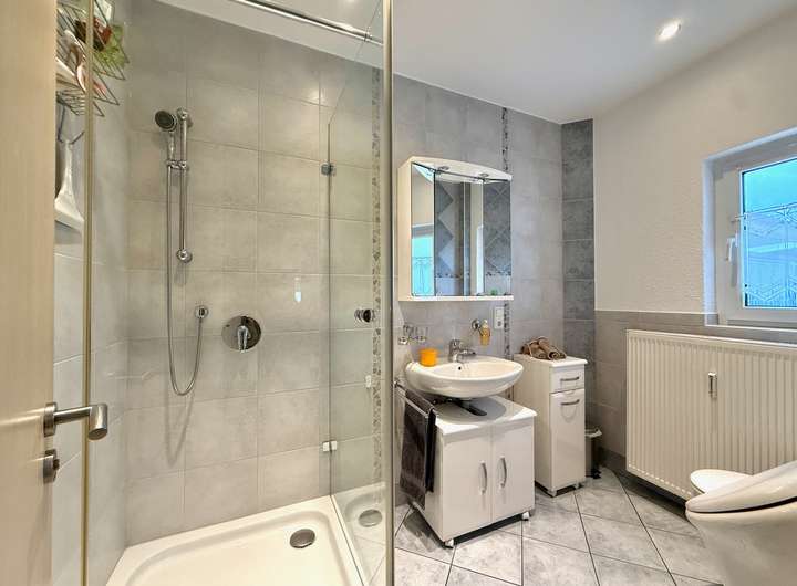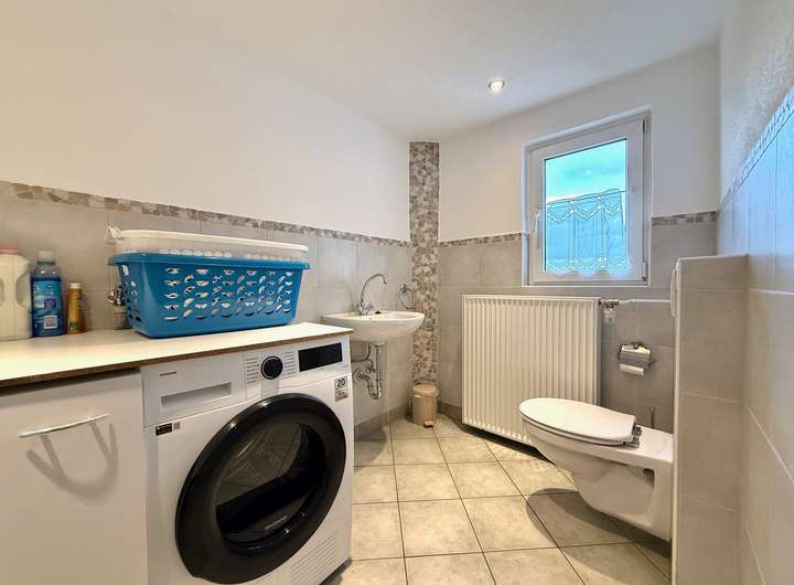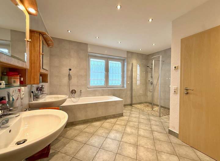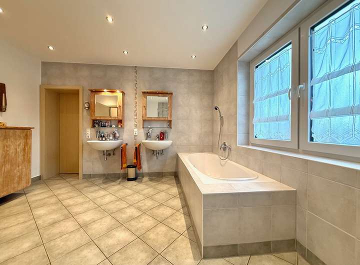 Das Obergeschoss überzeugt mit drei Schlafzimmern, einem großen Bad mit bodentiefer Dusche, Badewanne und Doppelwaschbecken sowie einem angrenzenden Hauswirtschaftsraum mit separaten WC. Ein Durchgangsraum bietet zudem die Option, eine zweite Küche einzurichten – perfekt für Mehrgenerationennutzung oder separate Wohnbereiche.