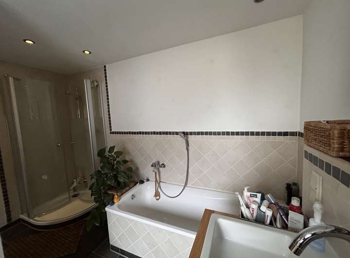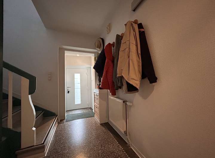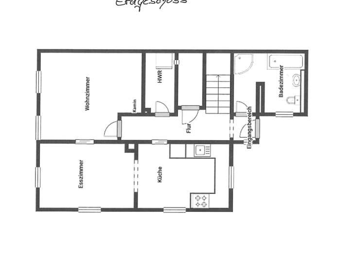 Flur, Windfang, Küche, Essen, Wohnen, Abstellraum, neuwrtiges Bad mit Dusche und Wanne