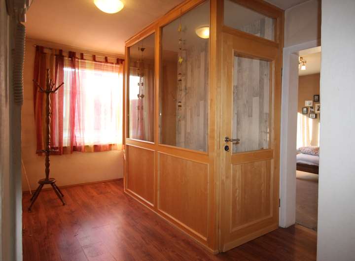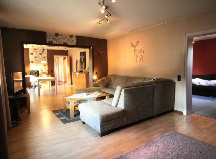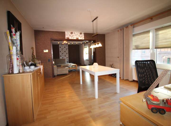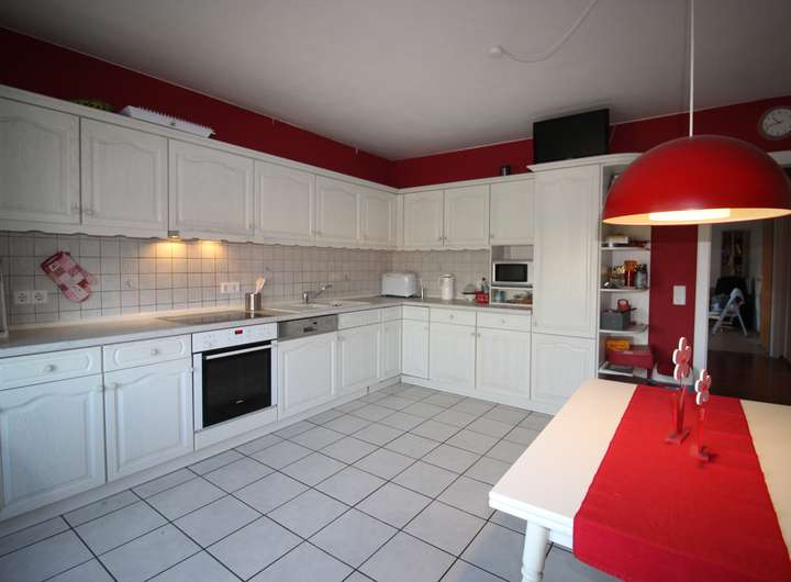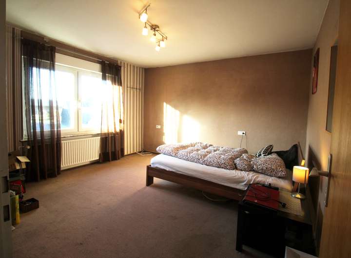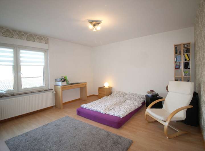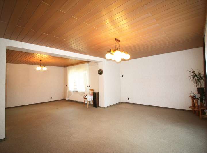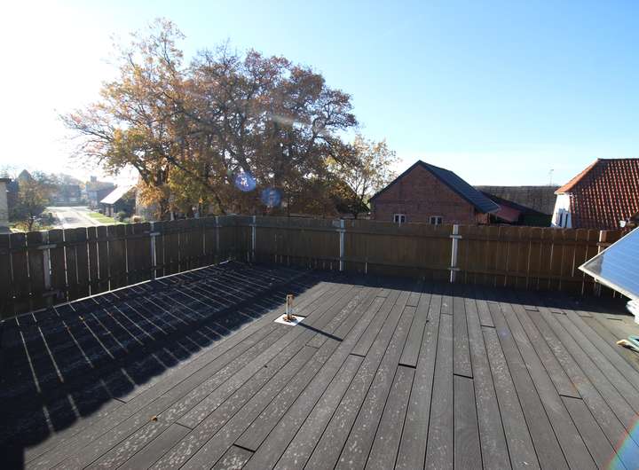 Im Obergeschoss gelangen Sie vom zentralen Flur in das große Wohn- und Esszimmer, das Badezimmer, die zwei hellen Schlafzimmer und die große Küche. Hinter dem Wohnzimmer befindet sich ein weiteres Schlafzimmer mit einem Zugang zum Balkon und der 40 m² großen Dachterrasse.