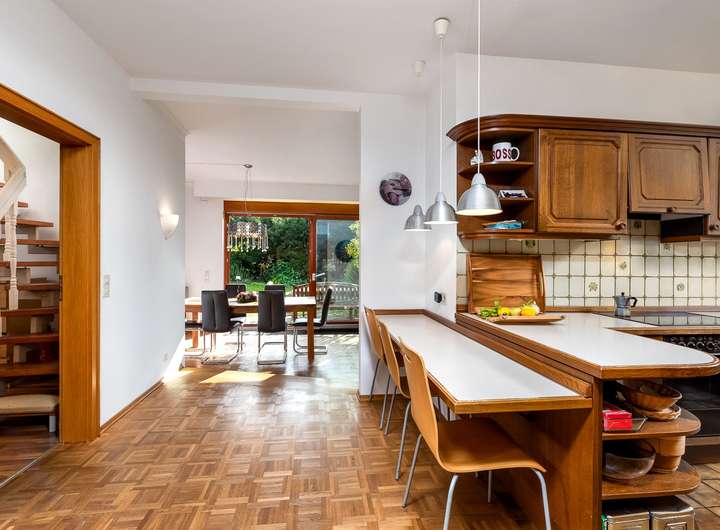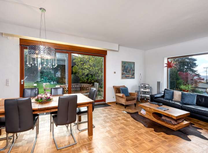 Bereits beim Betreten empfängt Sie ein einladender Eingangsbereich, der nahtlos in die offene Küche mit Essplatz sowie den weitläufigen Wohn- und Essbereich übergeht. Große Fensterflächen sorgen für ein angenehmes Licht- und Raumgefühl. Zwei direkte Ausgänge führen in den gepflegten Garten und auf die sonnigen Terrassen. Hier verschmelzen Innen- und Außenbereich zu einem harmonischen Lebensraum, der zu jeder Jahreszeit Behaglichkeit bietet.