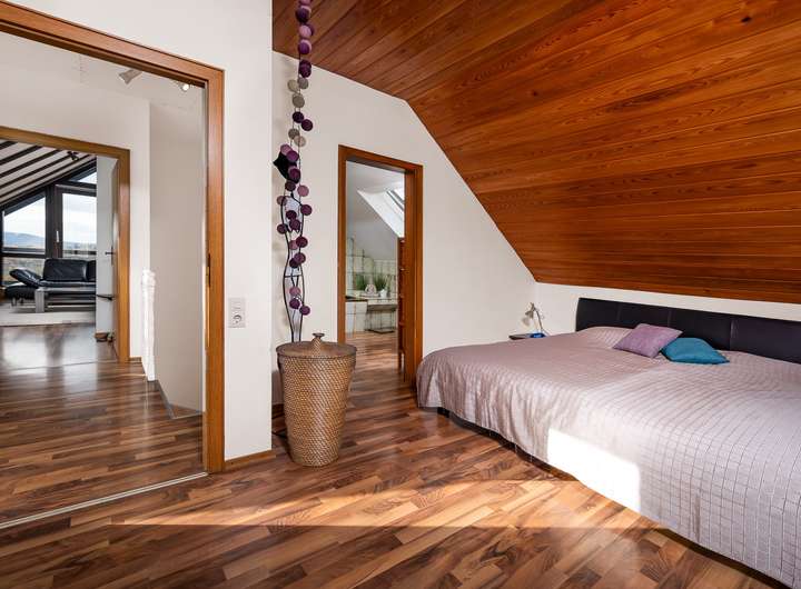 Das Obergeschoss bietet einen privaten Rückzugsort: Ein großzügiges Schlafzimmer mit angeschlossenem Badezimmer inklusive Badewanne sorgt für Komfort und Entspannung. Das zusätzliche Wohnzimmer auf dieser Ebene beeindruckt mit Zugang zum Balkon und einer herrlichen Fernsicht – perfekt, um den Tag in Ruhe ausklingen zu lassen.