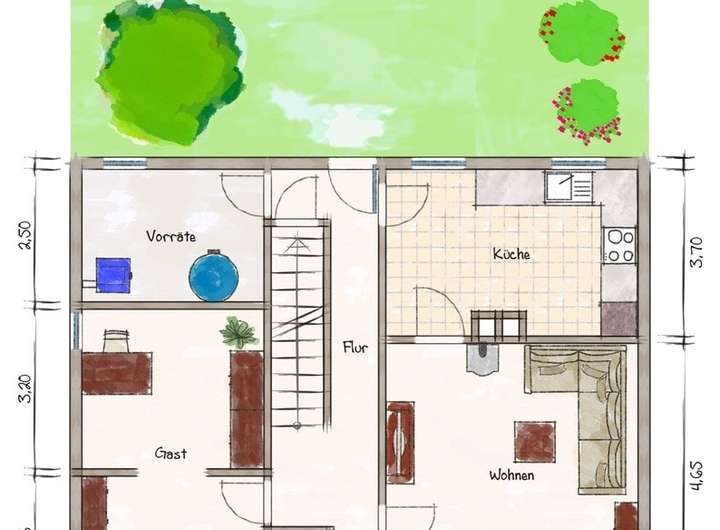 - eigener Garten mit Hühnerhaus + Gartenzimmer im Dachgeschoss des Nebengebäudes.