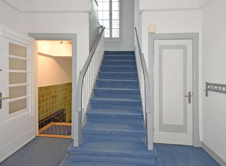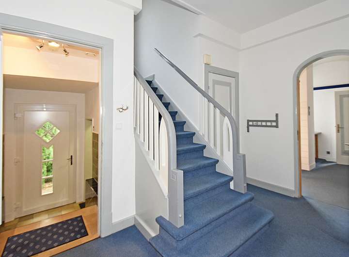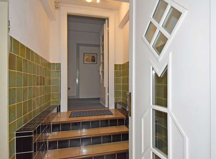 Betreten wird das Gebäude über einen auf der linken Seite gelegenen Hauseingang. Hier führen ein paar Stufen in die großzügige Diele der ansprechenden Beletage, die mit imposant hohen Decken und großzügigen Raumdimensionen überzeugt.