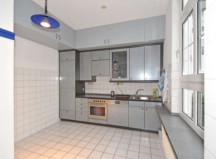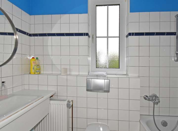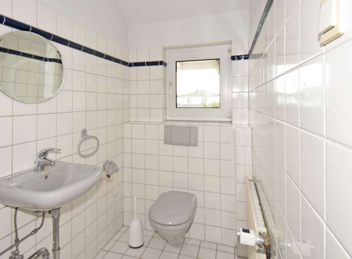 Im rückwärtigen Bereich des Erdgeschosses befindet sich derzeit die offen gehaltene Küche - ein Gäste-WC mit Badewanne und kleinem Fenster rundet das Raumangebot auf der Ebene ab.
