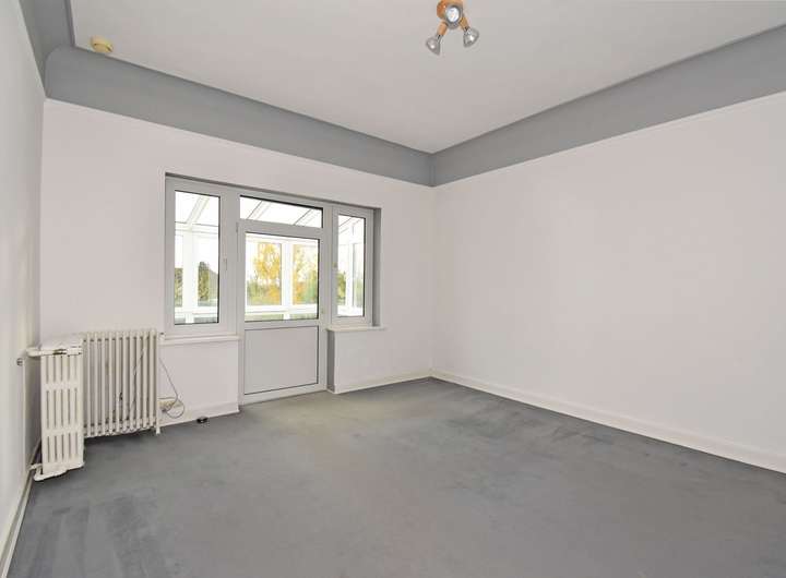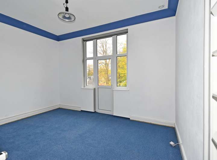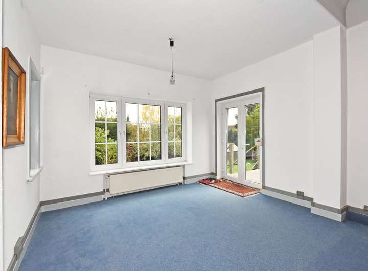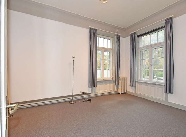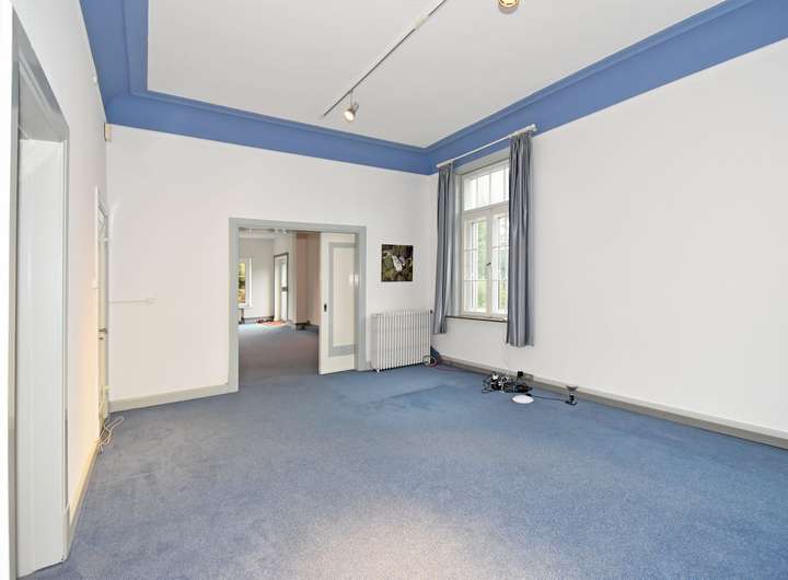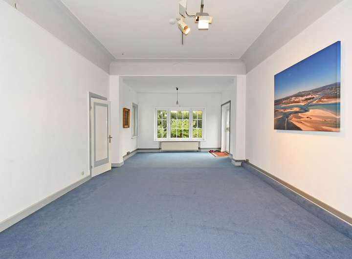Das Wohnzimmer ist mit seiner Weitläufigkeit und dem vorgesetzten Erker absolut beeindruckend. Während der Boden aktuell mit einer blauen Auslegware versehen ist, findet sich unterhalb dessen noch ein schöner Holzfußboden in Fischgrätmuster.